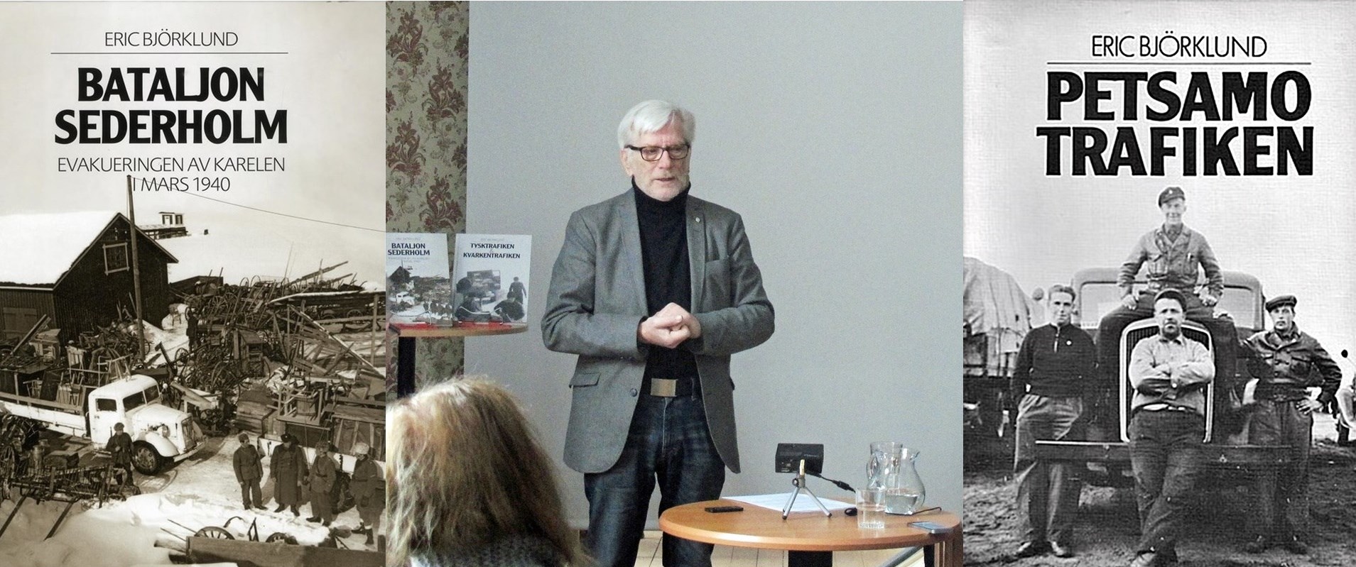 Eric Björklund föreläser omgiven av två av sina praktverk. Fotomomtage I 21 Kamratförening.