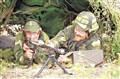 Kulspruteskytt Staffan Johansson med Robert Eriksson som laddare prövar en alternativ eldställning för en kulspruta. Foto Lars Boström.
